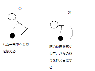 45度ぐらいの角度に腰を落として、ハムと背中の2パートからなるやり方なのだけど、自分の場合ハムの力が弱くて、背中のパートに移る事ができない事が多かった。