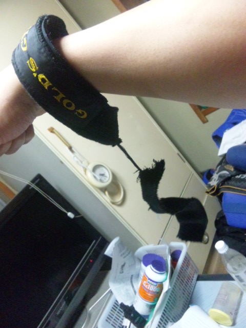 ブチブチと鈍い音が…何事かと思ったら、ストラップが逝ってしまった。